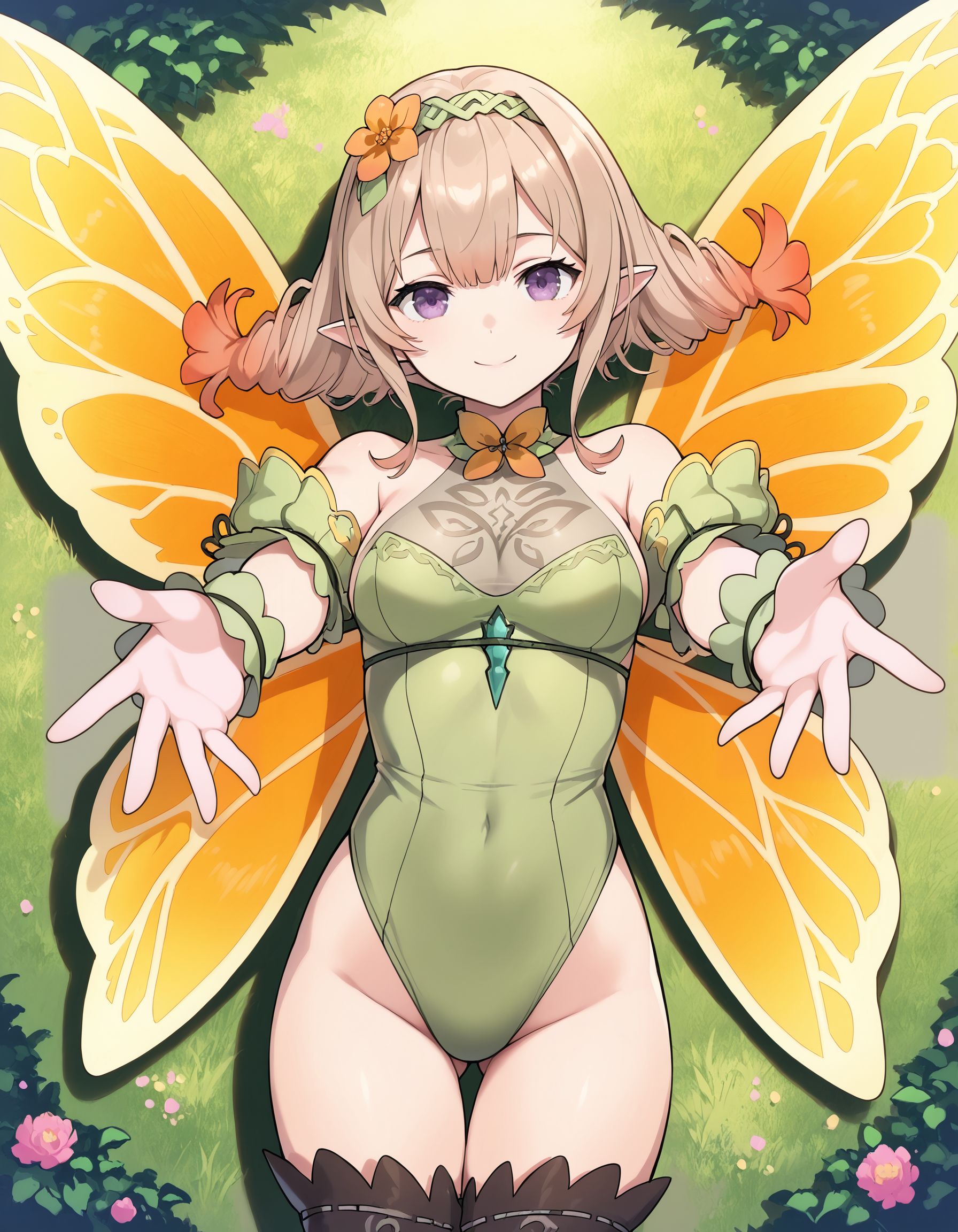 그녀의 전형적인 외모를 위해 "나비 날개, 머리띠, 팔찌, 손목 팔찌, 녹색 레오타드, 그라데이션 치마, 허벅지 부츠"를 추가하세요.