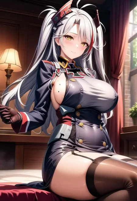 トリガーワード: eugen_a_xl, 長い髪, 両サイドアップ, 銀髪, 黄色い目, 大きな胸, 胸のほくろ, 天線髪, 頭部装備, 鉄の十字, そけい部の露出, 軍服, グレーのドレス, ボタン, 長い袖, 手袋, 黒い手袋, ガーターストラップ, 黒い太もも長ズボン,