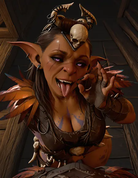 bg3truesoulgut, 1girl, shortstack, female goblin, colored skin, pointy ears, black sclera, brown hair, purple eyes, hair slicked back, medium breasts, ear piercing, earrings, skull hair ornament, bone hair ornament, blue tattoos, sharp nails,