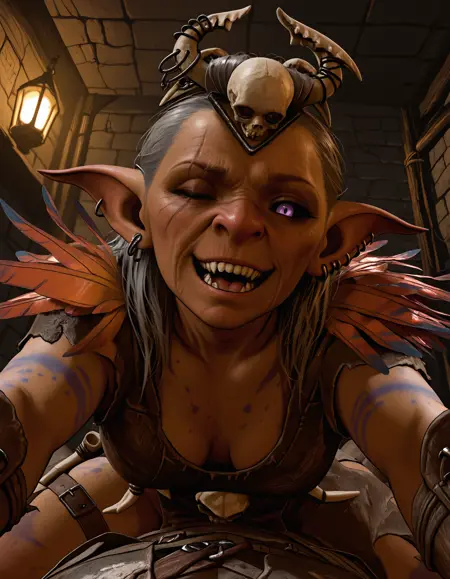 bg3truesoulgut, 1girl, shortstack, female goblin, mature female, colored skin, scar on face, right eye closed, wrinkled skin, grey hair, pointy ears, black sclera, purple eyes, hair slicked back, small breasts, ear piercing, earrings, scar on right eye, skull hair ornament, bone hair ornament, blue tattoos, sharp nails,