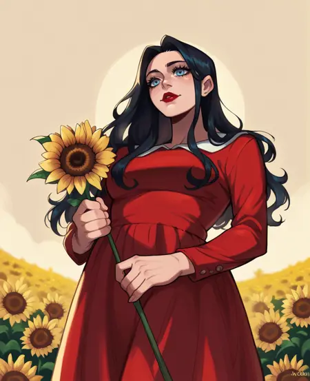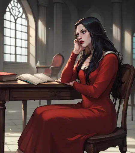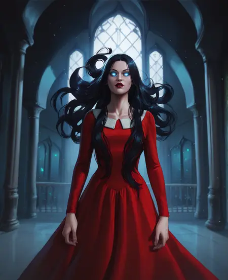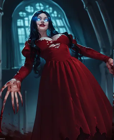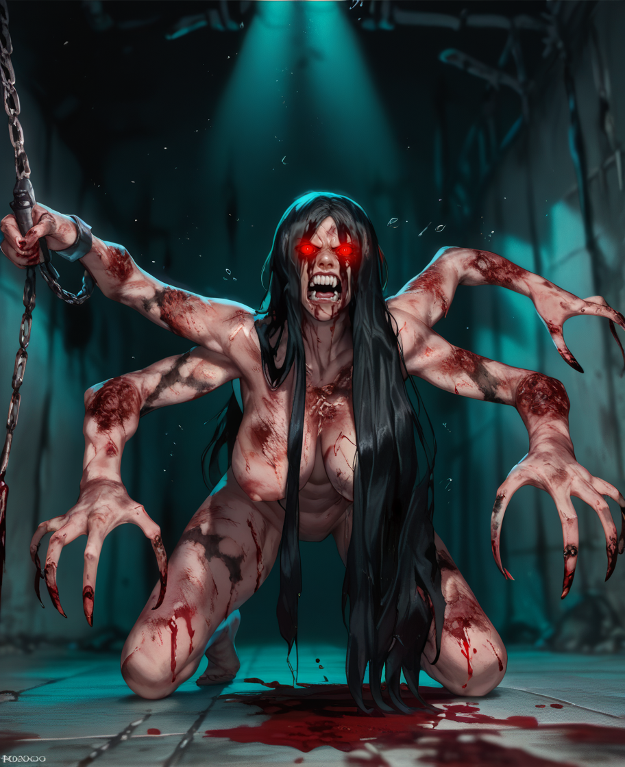 可添加红色连衣裙,或仅全身赤裸,身体上有血迹,头发遮住眼睛或一只眼睛——她的肢体可能较难控制/提示