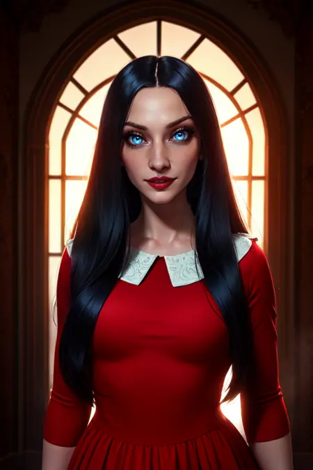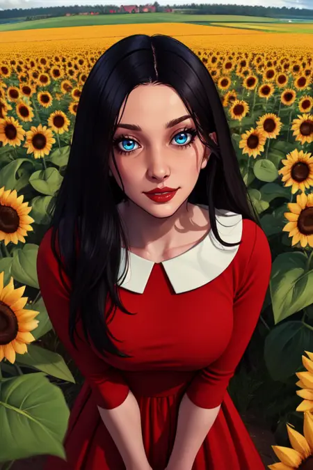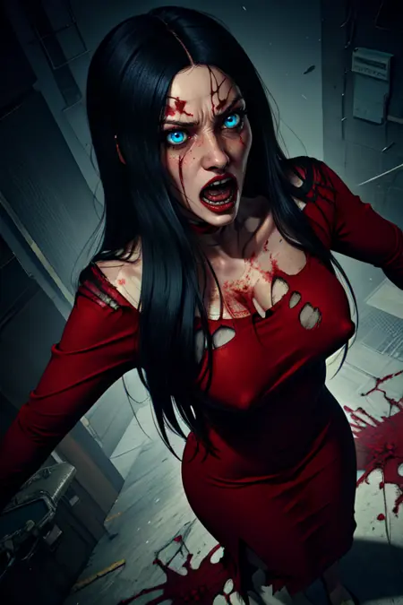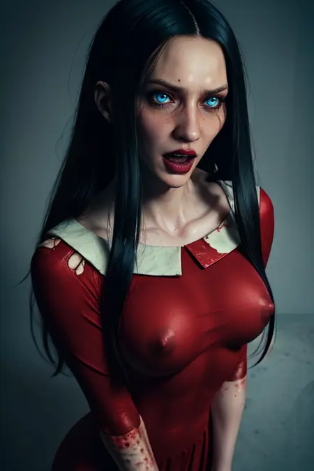 - can add red dress, or just fully nude, with blood on body, - hair over eyes, or one eye, - her limbs may be harder to control/prompt