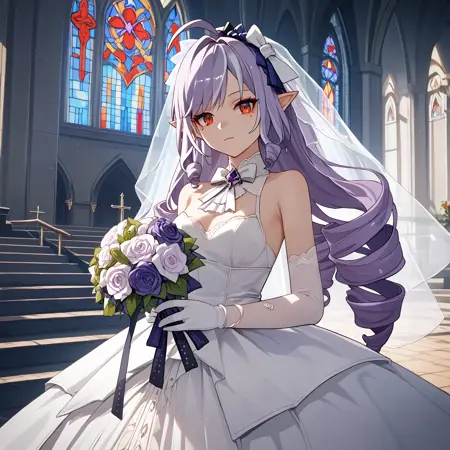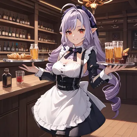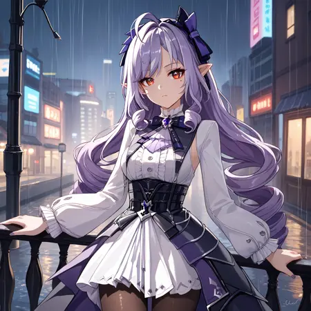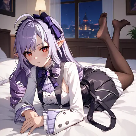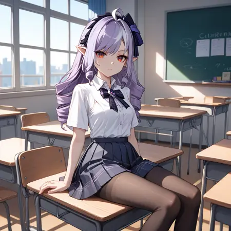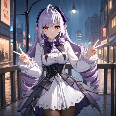 Default : vivian_(zenless_zone_zero), 보라색 머리카락, ahoge, 뾰족한 귀, 붉은 눈, 드릴 모양 머리카락, 눈밑 점, 머리띠, 브로치, 흰 셔츠, 중앙 플리츠, 긴 소매, 플리츠 소매, 보라색 애스코트, 허리 높은 치마, 흰 치마, 검은 치마, 갈색 팬티스타킹,