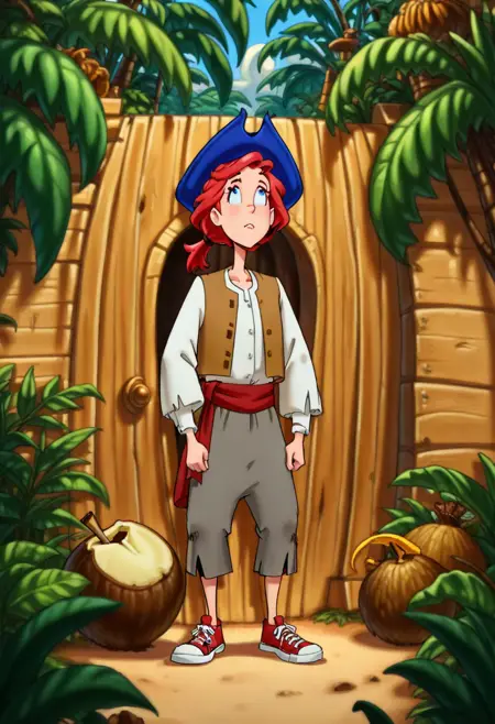 총 25개의 스크린샷(현대 복장 16장, 1700년대 복장 9장. 대화용 초상화 3장, 게임 오버 화면 3장, 나머지 게임 내 장면) + 팬아트 스케치 2점(저도 찾을 수 있을 줄 몰랐습니다) + 표지 이미지. 만약 시에라의 엔진 모딩 도구에 더 익숙했다면(실제로 존재하는 것으로 알려져 있지만, 제가 아는 모든 도구는 윈도우 전용이며 WINE 하에서 설정할 의향이 없음) 스프라이트를 직접 추출했을 텐데, 그 대신 화면 캡처를 해야 했습니다. 또 다른 경우로, 결과물이 기능적으로 작동할 것이라고는 전혀 예상치 못했는데, 생각보다 꽤 잘 나왔습니다. 제 제한된 테스트 결과, 스타일 LoRA를 사용하는 것이 분명히 도움이 됩니다. 왜냐하면 모델이 "기본"으로 무엇을 해야 할지 잘 모르기 때문입니다.