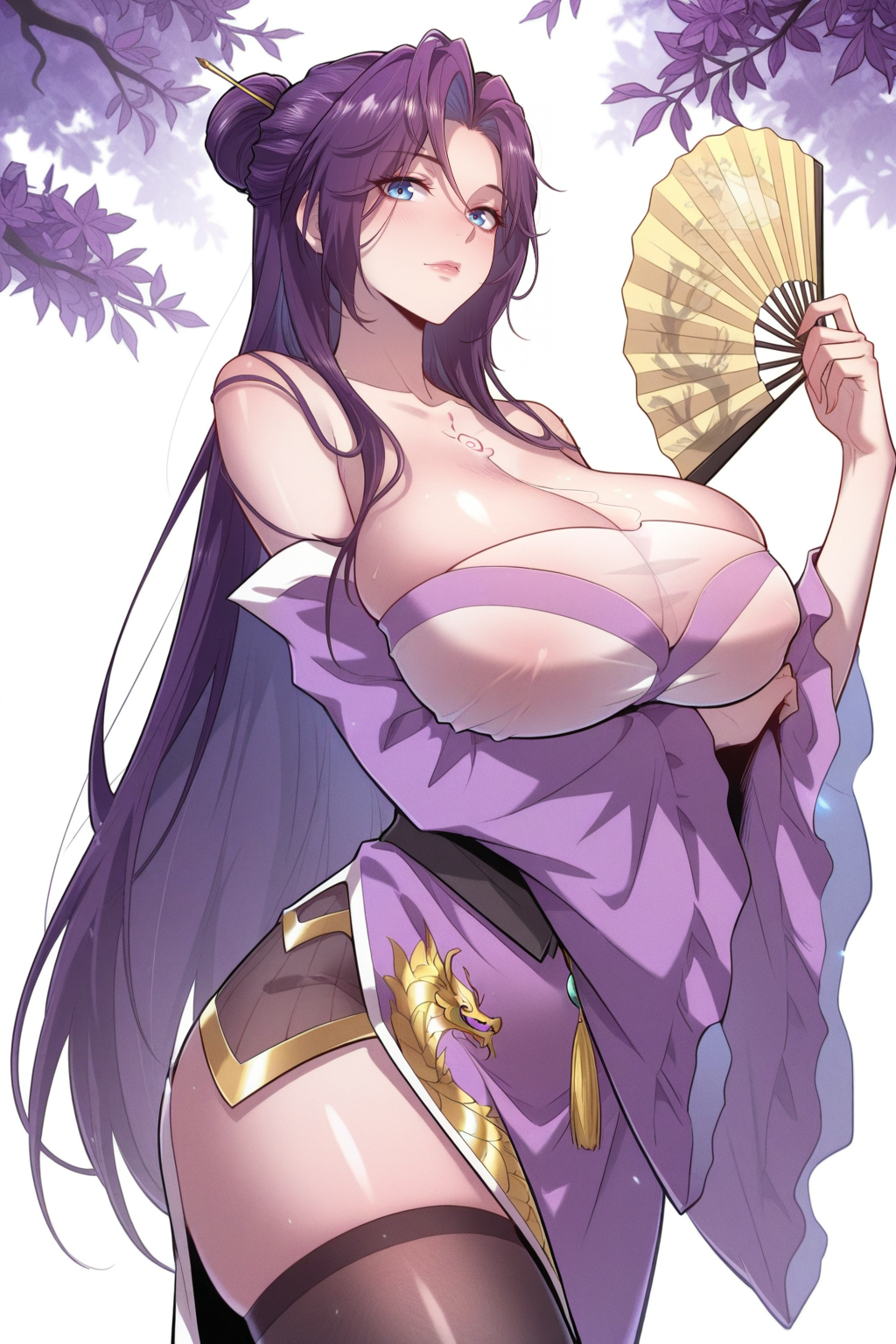 Yubingyun, Yubingyun_Cas, blue eyes, purple hair, hair bun, hair stick, tattoo on chest, see-through, chinese clothes, black sash, detached sleeves, gold print, black thighhighs