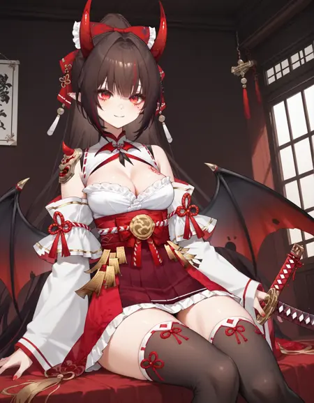 プロンプト:emiko、茶色の髪、赤い角、翼、赤い目、