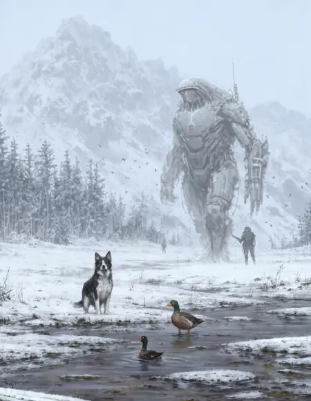一幅画:一名身穿棕色背心和帽子的男人站在雪地上,两头奶牛在旁,背景是大型机械步行机冒着烟,远处是连绵的山丘和树木,采用柔和的色彩调色板,运用强烈而分明的笔触,风格如雅库布·罗扎尔斯基