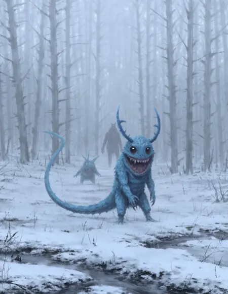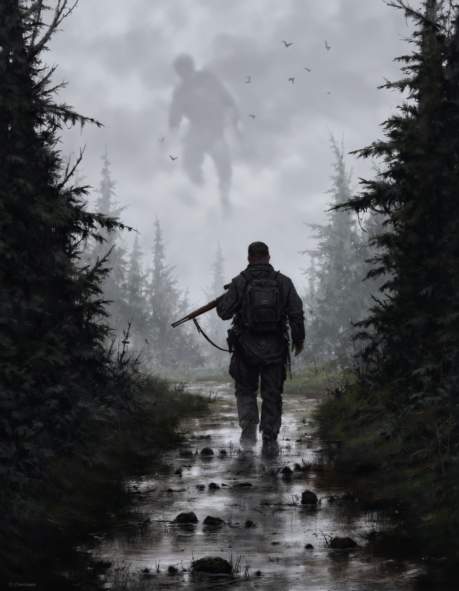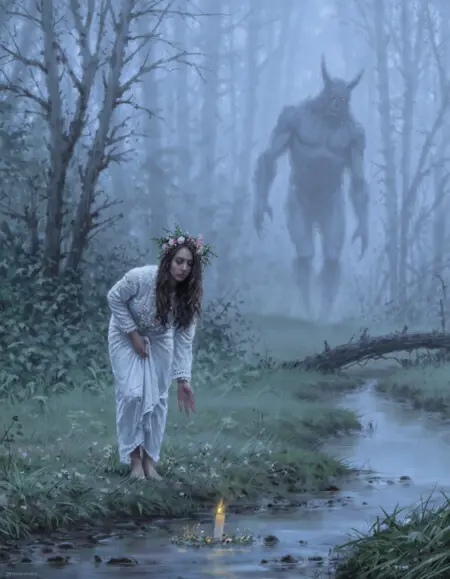 a painting of a woman in a long white dress and floral wreath leaning over a stream to place a floating candle, with a shadowy creature lurking in the misty forest background, the scene drenched in cool blues and greens, featuring soft and smooth brushstrokes in the style of jakub-rozalski