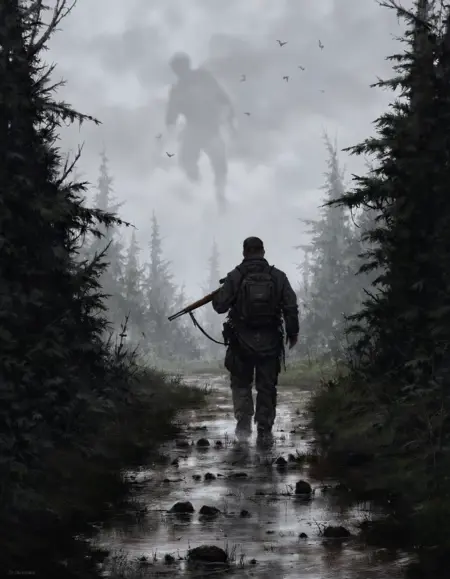一幅画:一名身着白色长裙、头戴花环的女子正俯身溪流,放置一盏漂浮的蜡烛,朦胧的森林背景中隐约有阴影生物潜伏,场景浸染在冷调的蓝色与绿色中,笔触柔和流畅,风格如雅库布·罗扎尔斯基
