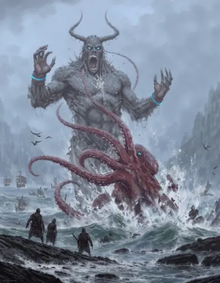 一幅画:一名身披青铜盔甲、手持盾牌与长剑的战士正面对一只巨大的角状生物,前景中一名身着红色服饰的女子手持长矛,背景为荒凉的紫灰色 Landscape,远处有废墟,采用柔和的晕染与细致的笔触,风格如雅库布·罗扎尔斯基