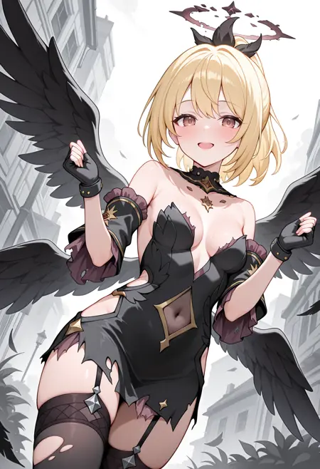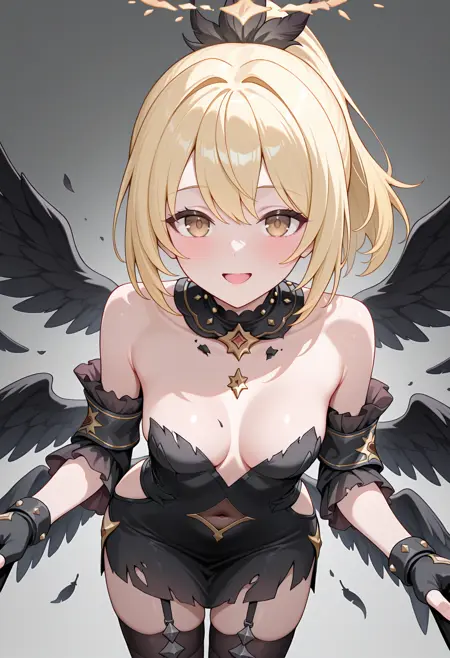 - kuriafal, ponytail, broken halo, black dress, torn dress, short dress, cleavage, black collar, plunging neckline, navel cutout, covered navel, hip vent, strapless, detached sleeves, fingerless gloves, black gloves, garter straps, black thighhighs, black wings, multiple wings,