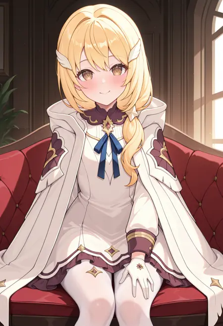 kuriadef, wing hair ornament, low ponytail, white cloak, white dress, blue ribbon, long sleeves, gloves, white pantyhose, pantyhose cutout,