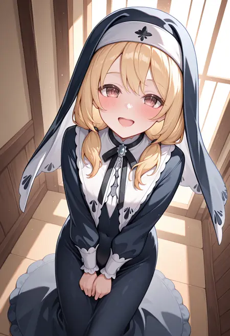 - nun, low twintails, habit, black dress, long sleeves,
