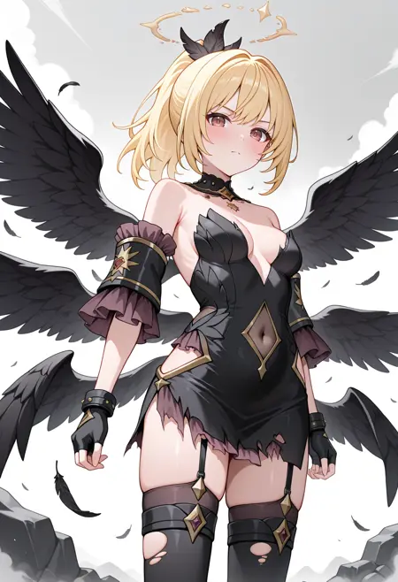 - kuriafal, ponytail, broken halo, black dress, torn dress, short dress, cleavage, black collar, plunging neckline, navel cutout, covered navel, hip vent, strapless, detached sleeves, fingerless gloves, black gloves, garter straps, black thighhighs, black wings, multiple wings,