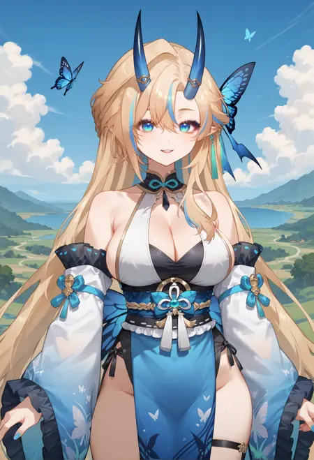 Prompts : mizu, blonde hair, blue oni horns, blue eyes, blue demon wings,
