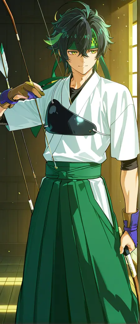 触发词:日本服饰、袴裤、袴上衣、弓道、裙子、和服、胸当、手套、弩手套、半指手套、射箭、箭(投射物)、弓(武器)