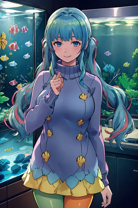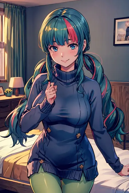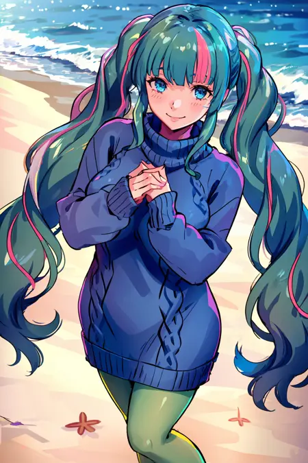 彼女のカジュアルな服装は**amamecasual, blue sweater, turtleneck, green pantyhose, twintail, blunt bangs, streaked hair**