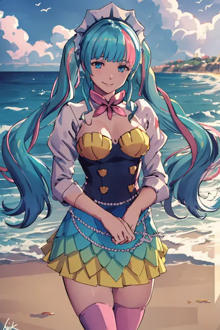 彼女のメイド服は**amamemaid, dress, shells, pink thighhighs, skirt, twintail, blunt bangs, streaked hair**