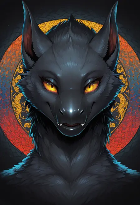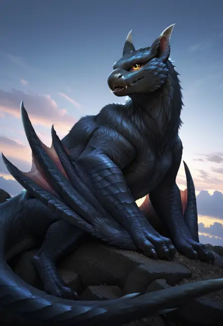 dragon, yellow sclera, black fur, sharp teeth, fangs, claws, wings, winged arms, tail,