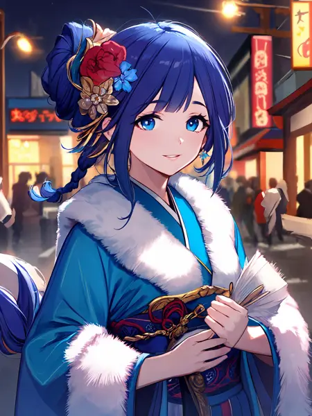 파란색 머리카락, 파란색 눈, 단발, 머리묶음, 한쪽에 단일 땋은 포니테일, 머리 장식;