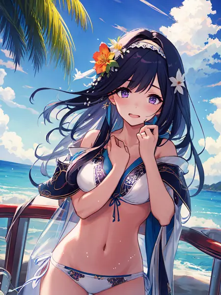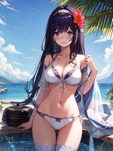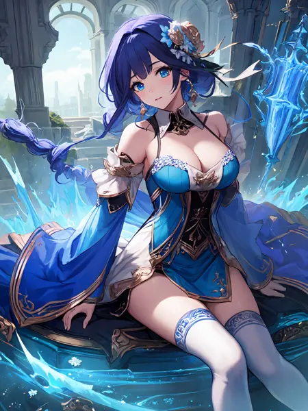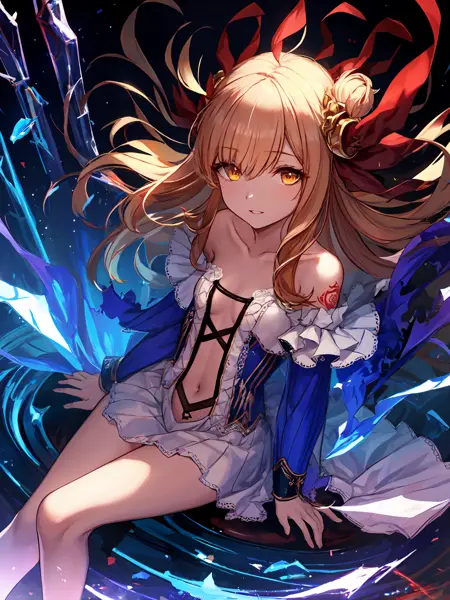 어깨 노출, 견골 노출, 십자 매듭 의상, 흰색 및 파란색 드레스, 프릴, 분리된 소매, 의상 커팅, 허벅지 스타킹, (가슴 노출, 배꼽, 문신);