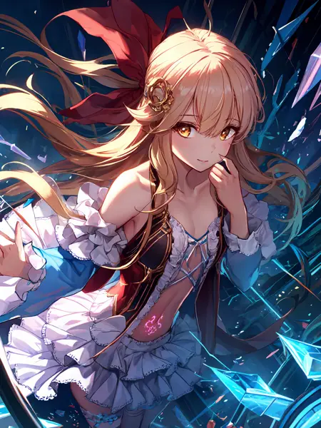 금발 머리, 평평한 가슴, 노란색(주황색) 눈, 머리 장식;