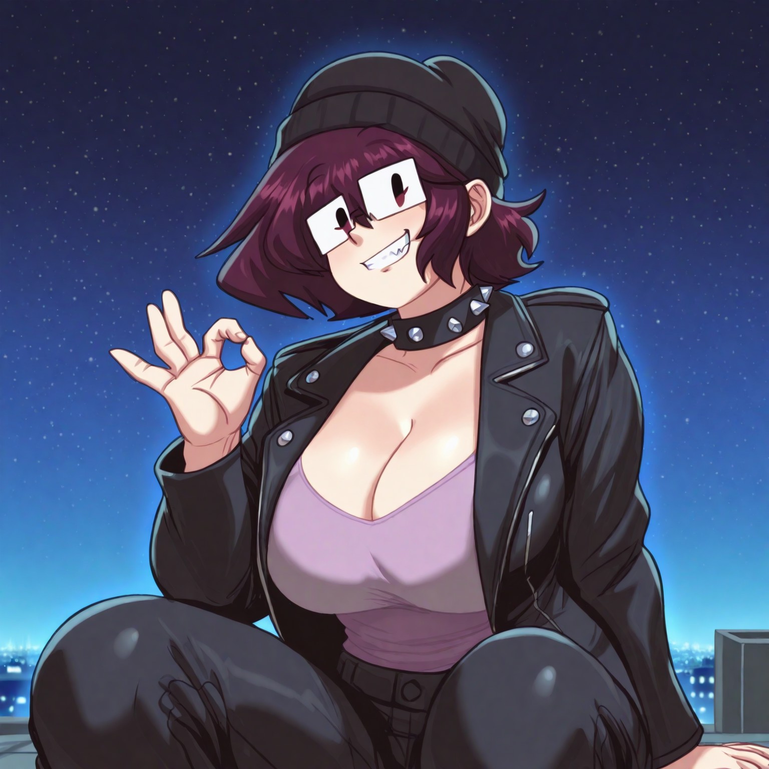 Positive Prompts: LuluLD, white female, light-skinned female, brown hair, short hair, black eyebrows, thin eyebrows, eyebrows visible through hair, square glasses, black eyes, big breasts
