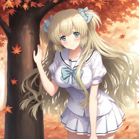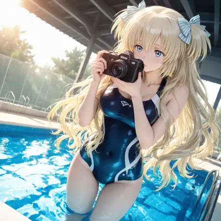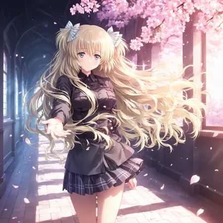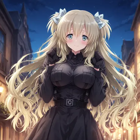 태그: LiseILL, 1girl, solo, liz_hohenstein, schwarzesmarken, long hair, blonde hair, blue eyes, bow, hair bow, two side up, ribbon, hair ribbon, 4 fingers, striped bow
