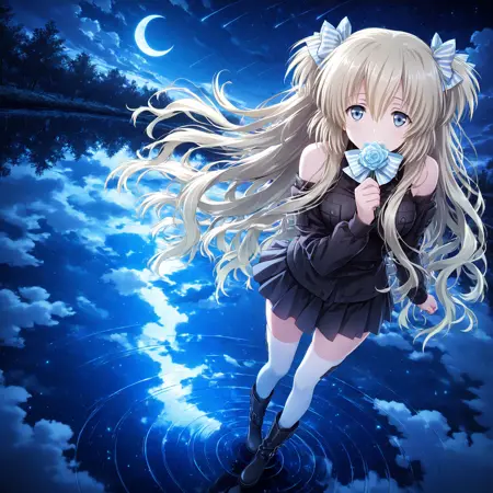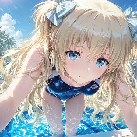 タグ: LiseILL, 1girl, solo, liz_hohenstein, schwarzesmarken, long hair, blonde hair, blue eyes, bow, hair bow, two side up, ribbon, hair ribbon, 4 fingers, striped bow