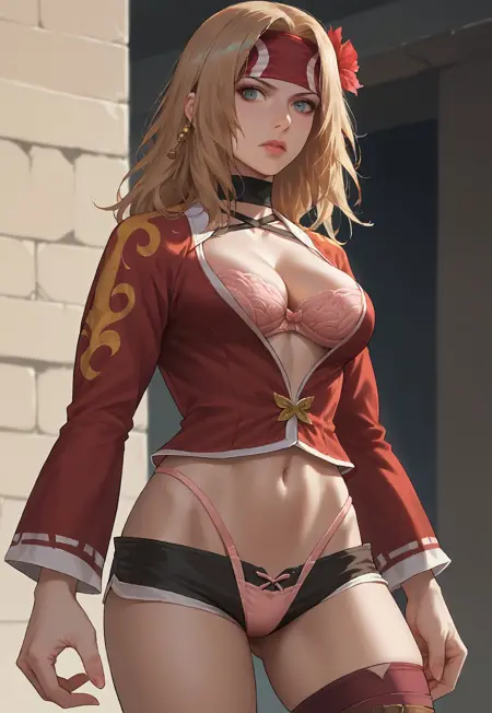 服装 - 夹克、胸衣、露乳、露腹、项圈、粉红色内裤、外穿内裤、短裤、单边长筒袜、靴子、高跟鞋