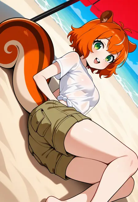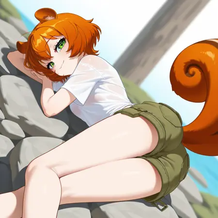 squirrel girl,squirrel ears,tall ears,ear fluff,squirrel tail,buck teeth,orange hair,green eyes,