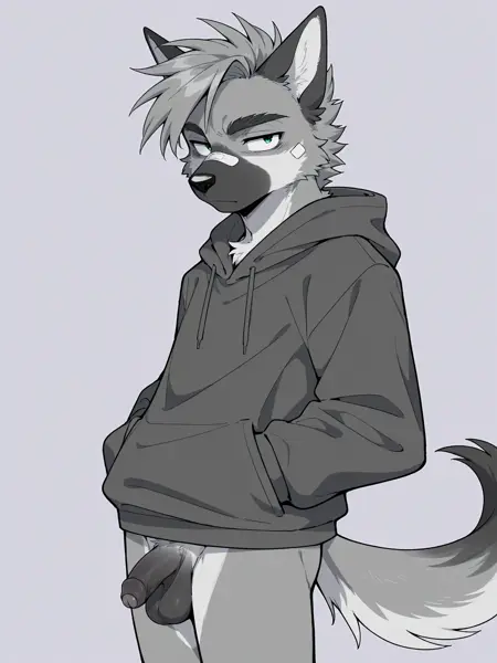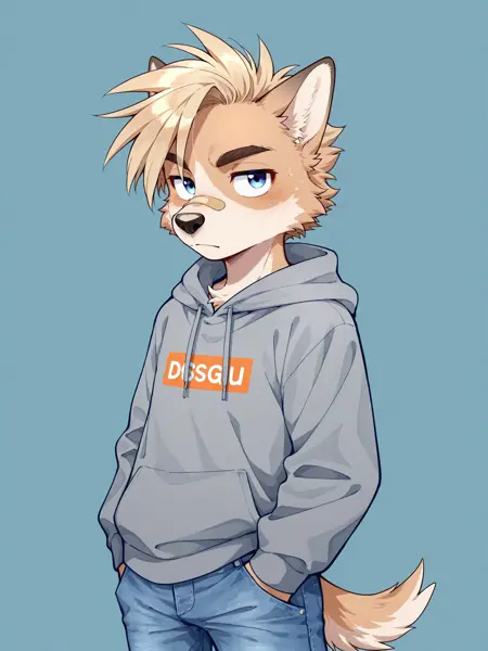 furry male, male focus, animal ears, short hair, dog boy, hoodie, bandaid on nose, bandaid on face, hood down, osugakikunv2styleil,
