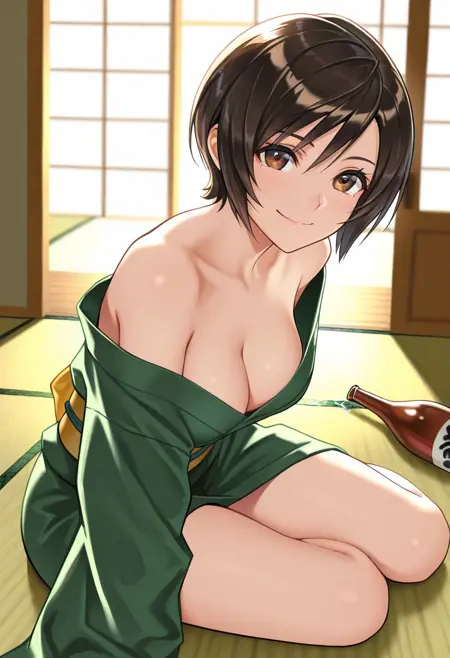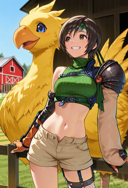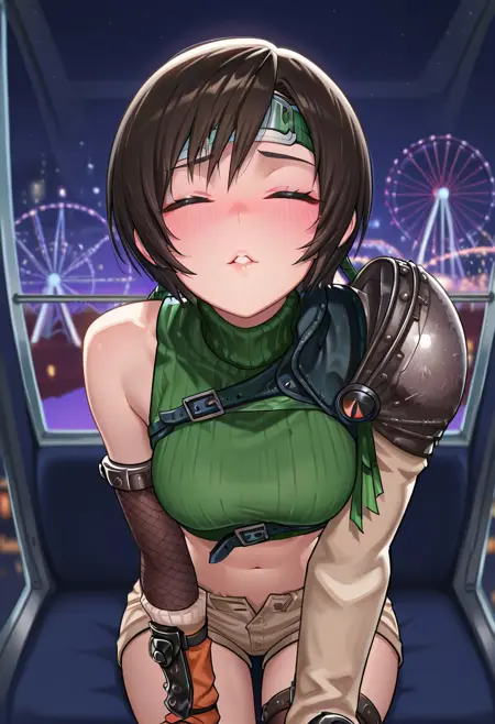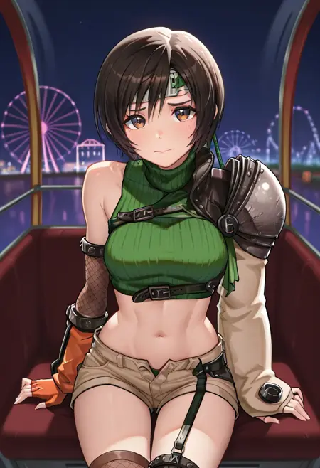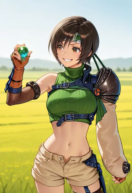 《最终幻想VII》中的尤菲。这可以还原她的默认服装以及《最终幻想VII 重生》中的夏季服装(尽管由于难以找到足够多的参考图,夏季服装可能略有不一致)。权重设置为1到0.8即可。