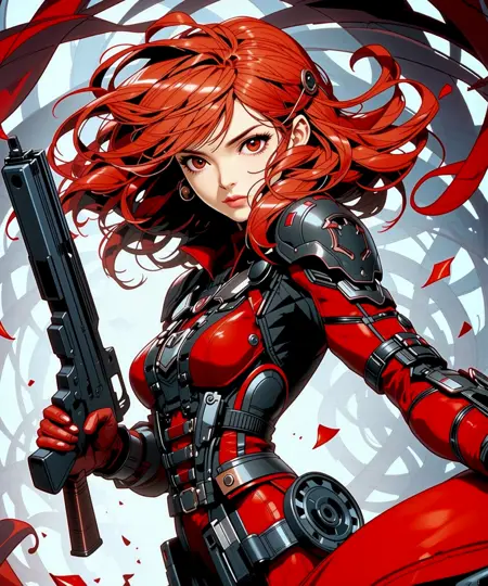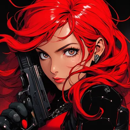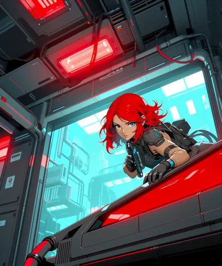 示例: "anime kzk woman with red hair, sneaking inside a sci-fi megatower interior, holding a gun in a dark room with red light coming from behind her"