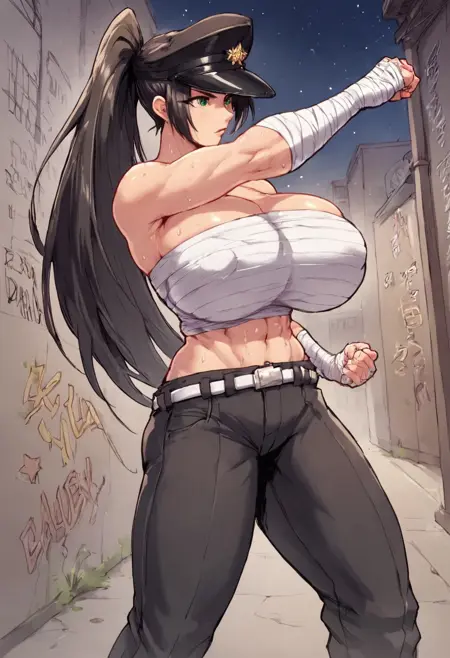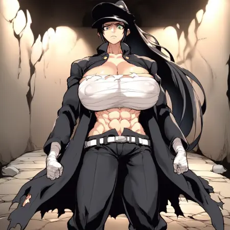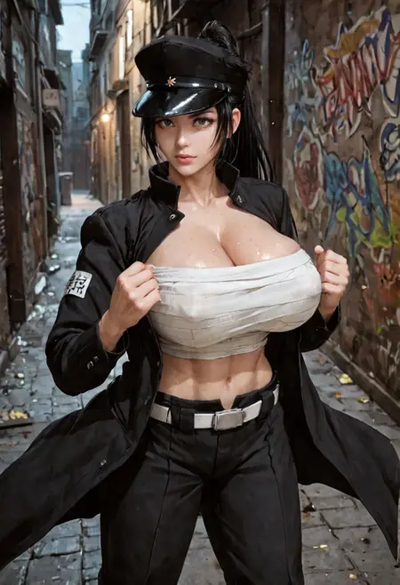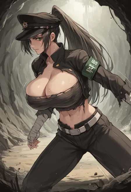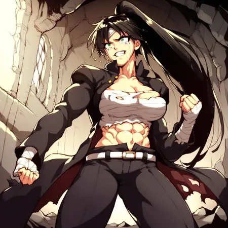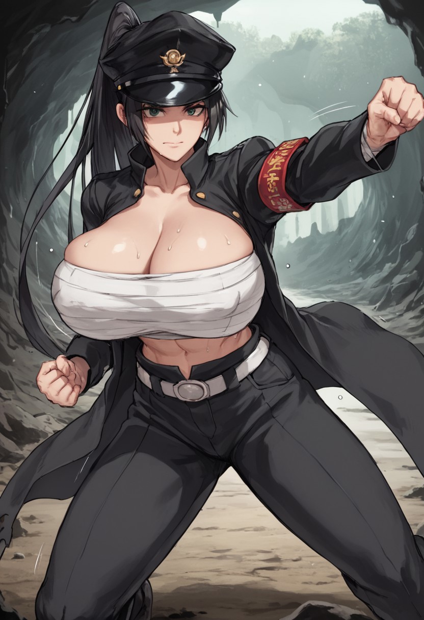 0n1zuk4su84ru, ponytail, long hair, hat, chest sarashi, budget sarashi, cleavage, midriff, abs, long coat, gakuran, belt, pants, open clothes, armband, bandages, large breasts