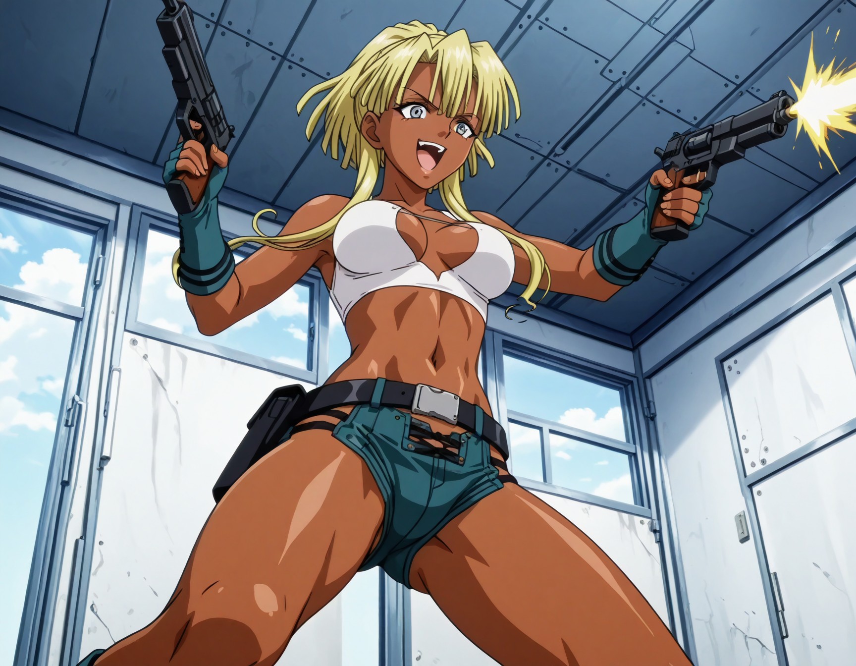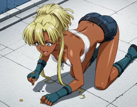 トリガーワード: daphne_gloria, dark-skinned_female, fingerless_gloves, white crop_top, navy short_shorts, belt