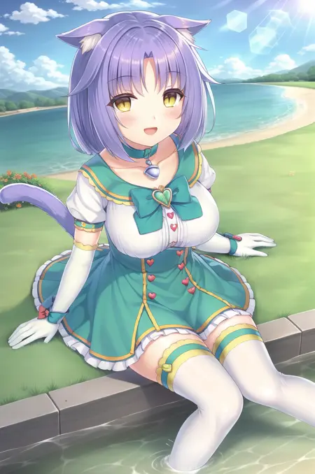 outfit_2、ベルトカラー、青いカラー、首輪の鈴、赤いリボン、青いドレス、ふんわりした短い袖、フリル付きドレス、グリーンの手袋、グリーンの膝丈靴下、