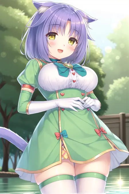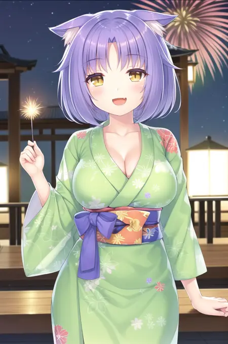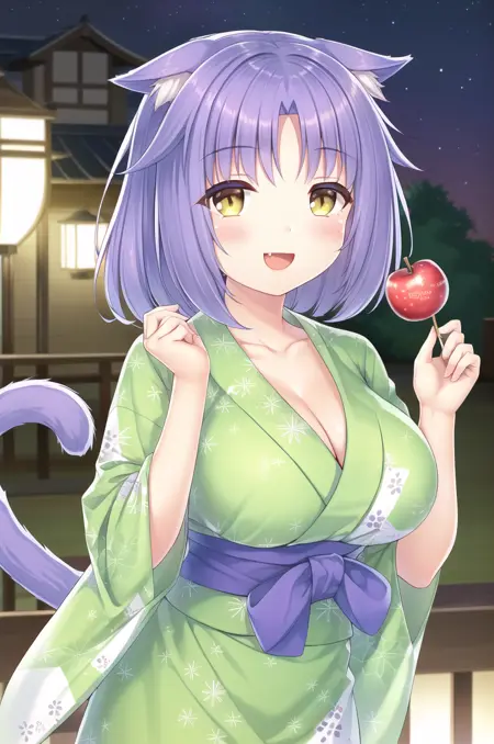 <lora:Cinnamon-Pony-v1-07:0.6>, ChopioCinnamon, 猫の耳、紫の髪、高いポニーテール、黄色い目、観察者を見つめる、