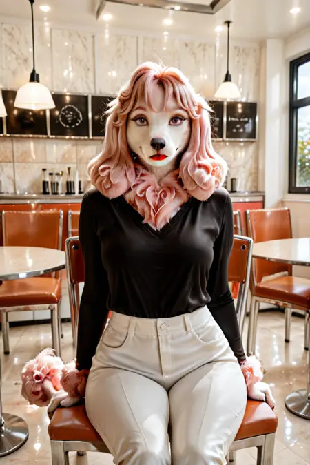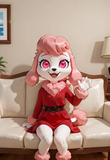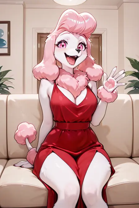 Tags: furry female, renata, poodle, dog ears, dog tail, pink hair, pink chest tuft, pink eyes,