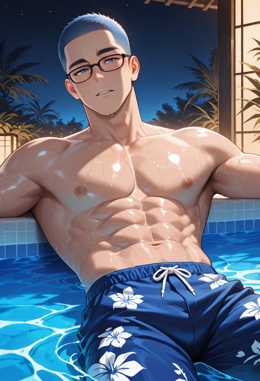 视觉:1个男孩,成熟男性,独处,深蓝色头发,蓝眼睛,剃短发,蓝眼睛