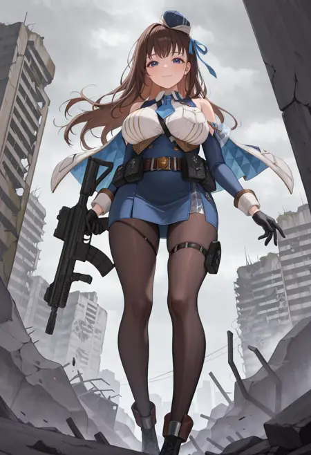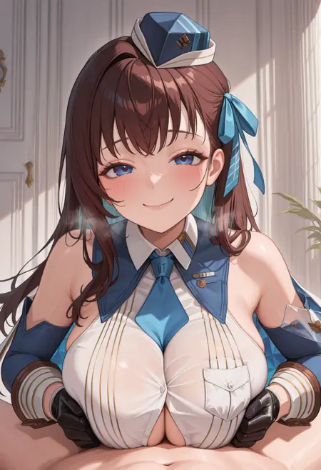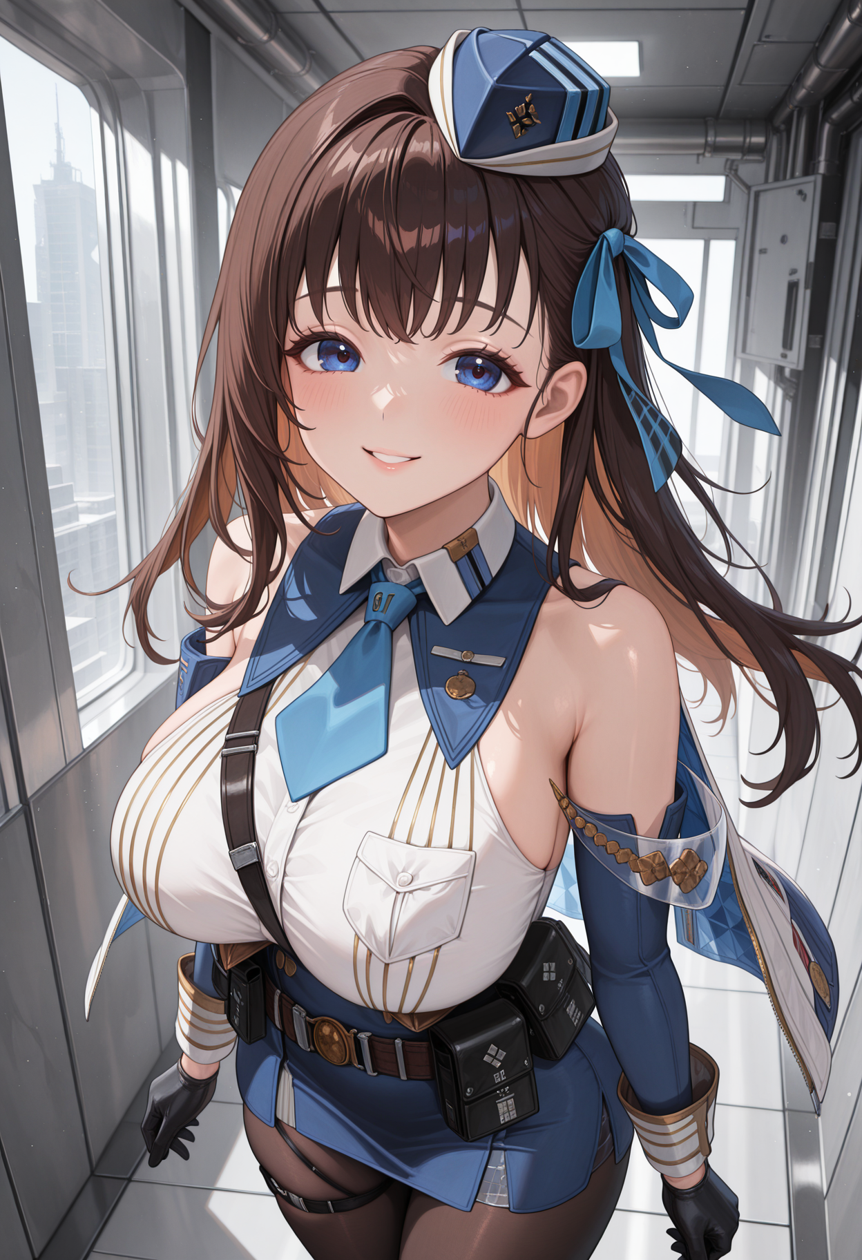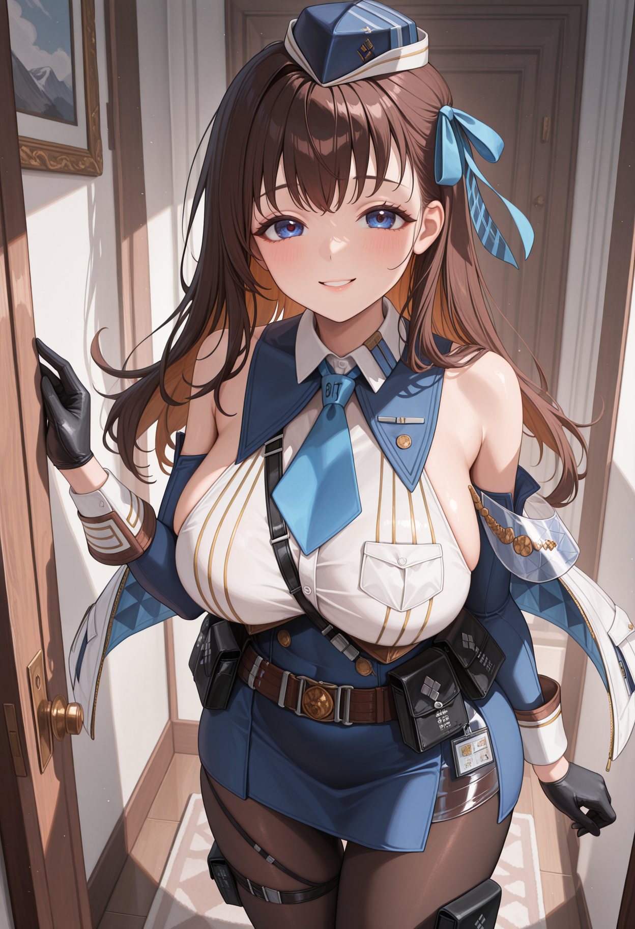mrnnkk, 파란 눈, 갈색 머리, 긴 머리, 앞머리, 큰 가슴, 군모, 파란 리본, 머리 리본, 파란 넥타이, 칼라 셔츠, 흰 셔츠, 소매 없음, 가슴 주머니, 분리형 소매, 카페트, 파란 치마, 검은 장갑, 팬티스타킹, 벨트 주머니