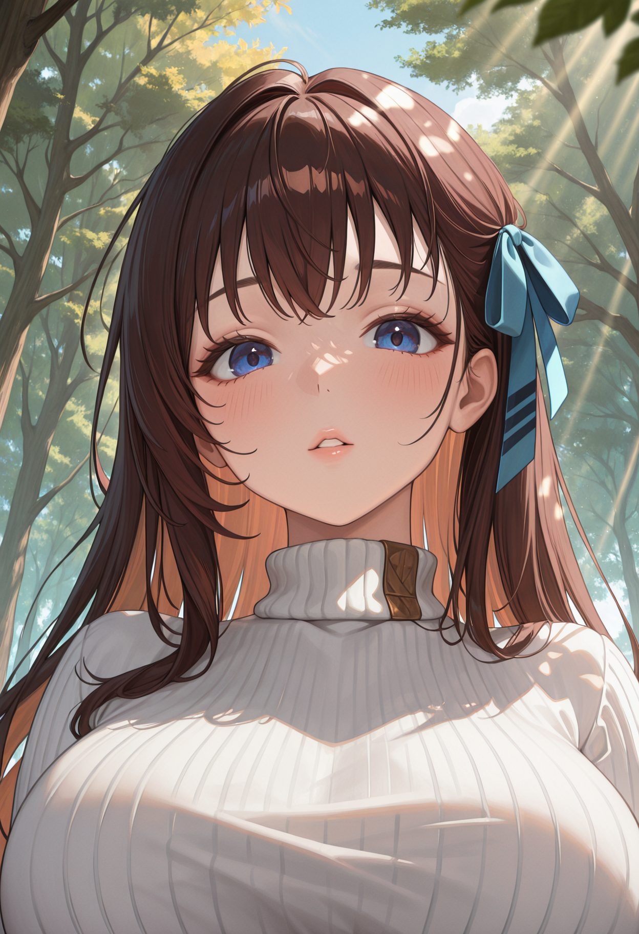 mrnnkk, 파란 눈, 갈색 머리, 긴 머리, 앞머리, 큰 가슴, 머리 리본, 파란 리본