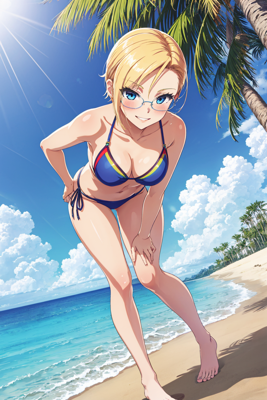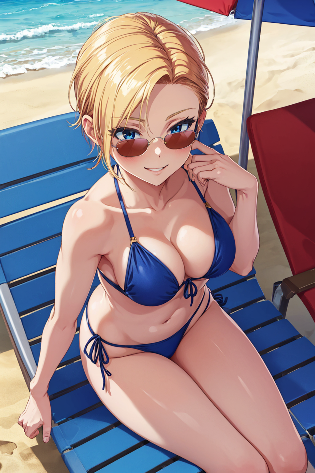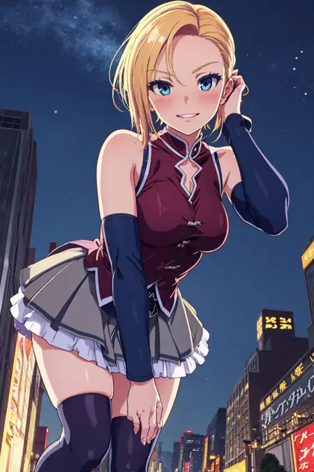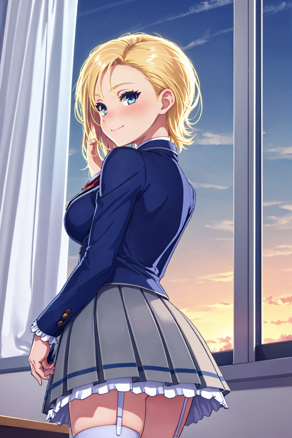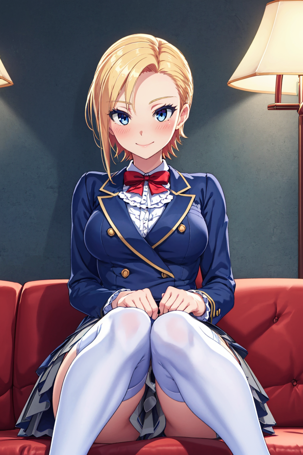 ・blond hair, blue eyes, short hair, blue jacket, red ribbon, frills, gray skirt, white thighhighs, black loafers,