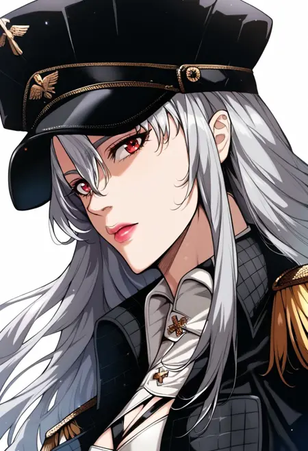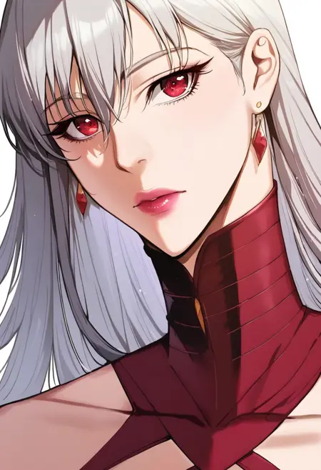 캐릭터: 엘노르, 1소녀, 가슴 노출, 빨간 눈, 분홍색 입술, 긴 머리, 회색 머리, 앞머리