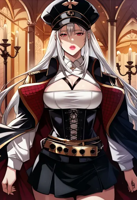 아우트핏1: 군용 검정 모자, 뾰족한 모자, 검정 장갑, 흰 셔츠, 검정 치마, 검정 코르셋, 어깨장식, 검정 코트, 군복, 검정 허벅지 양말, 벨트, 칼