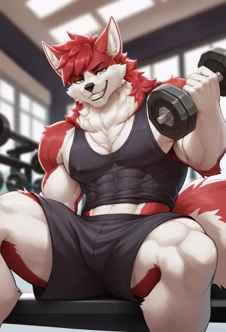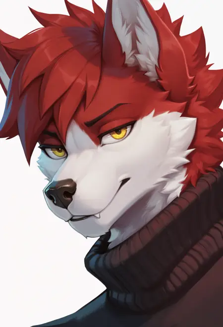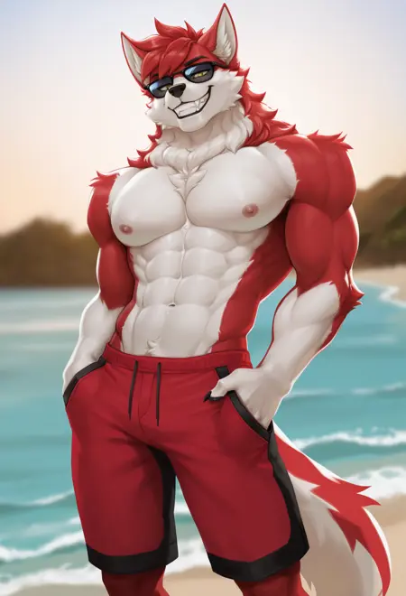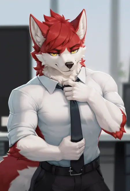 角色标签:兽人男性、动物耳朵、狼男孩、白色毛发、狼尾、双色毛发、红色毛发、红发、短发、黄眼睛、健壮男性、腹肌、宽大胸肌