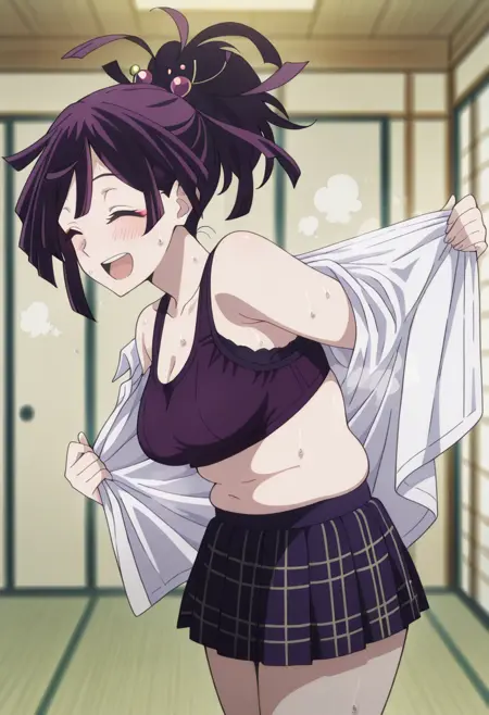lora:undressing-illustriousxl-lora-nochekaiser:1, 服を脱ぐ, 下着, 衣服を引っ張る, 自分の服を引っ張る, ブラ, パンツ, パンツを引っ張る, シャツをめくる, 開いたシャツ, スカートをめくる, 衣服をめくる, 室内, ベッド, 寝室, 顔を赤らめる, 視聴者を見る, シングル, カウボーイショット, ハンガリー角度