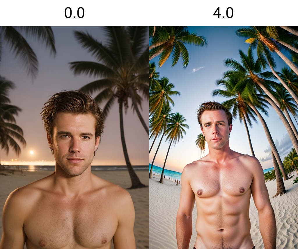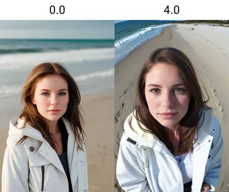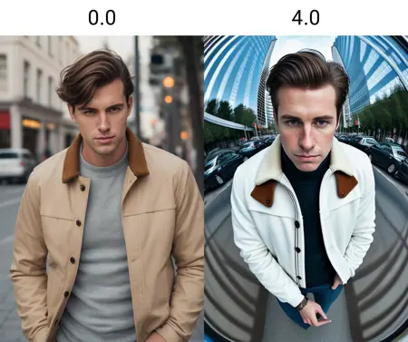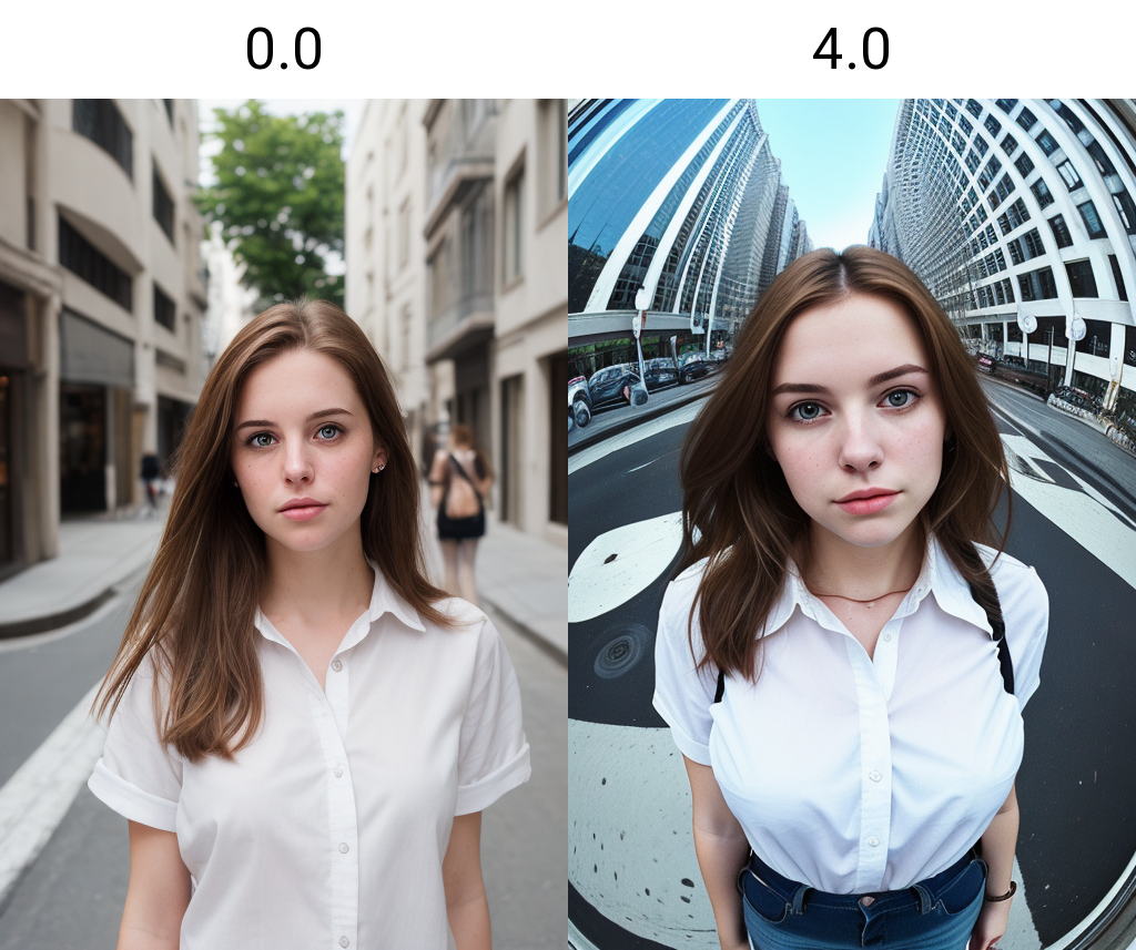 권장 가중치: 0에서 +3까지. (사용 중인 모델에 따라 다름) 이 슬라이더는 음수 쪽에서는 효과가 없으며, 기본적으로 가중치가 조정된 일반 LoRA입니다. 하지만 저는 매우 좋아하며, 실제 물고기 눈을 생성하지 않고도 왜곡 효과를 훨씬 쉽게 제어할 수 있습니다.