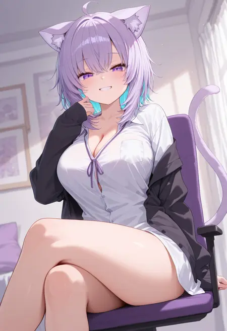 基础提示:okayu,紫色眼睛,紫色头发,中长发,呆毛,猫娘,猫耳,猫尾,大乳房,