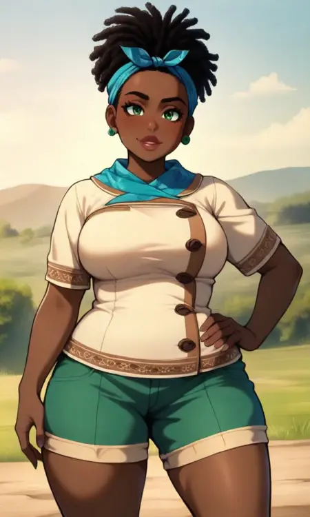 Meridian, African American female, mature female, {chubby}, large breasts, wide hips, black hair, blue bandana, goggles on forehead, green stud earrings,